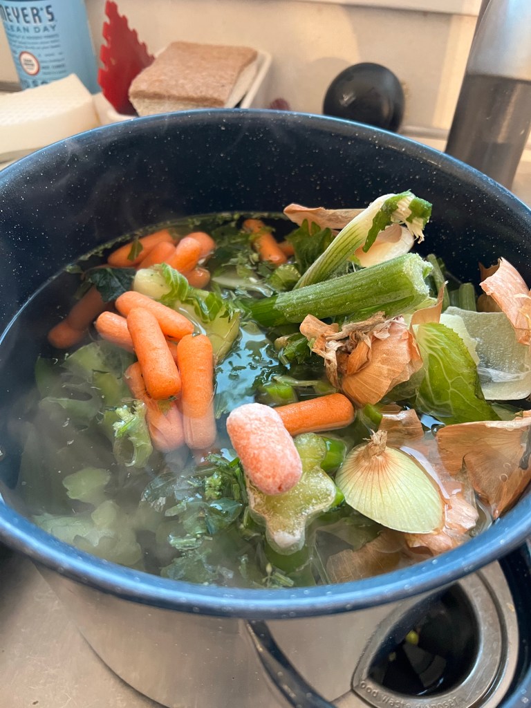 So years ago….so long ago I honestly can’t remember I started making my own broth (I have another post about making vegetable broth from my veggies scarps). It started while trying to make my Noni’s soup from an oso busco and it has evolved from there. Please don’t think I am making homemade broth for all my cooking-nope still coming in hot with the box of broth for a lot of things. But when I can I try and make my own. Making homemade chicken stock is a favorite of mine to do with a leftover roasted or rotisserie chicken. When we are done eating the chicken I will either make the soup the next day or freeze what’s left to make broth/soup another day. So this is what I pulled out of my freezer for making the broth…These bags of frozen veggie scraps, a chicken carcass, and two legs we didn’t eat from the same bird.